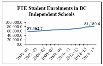 Between 2000–01 and 2016–17, the full-time equivalent (FTE) student enrolment in BC independent schools increased from 57,462.7 to 81,180.6. This is an increase of 41.3% (Source: BCTF)