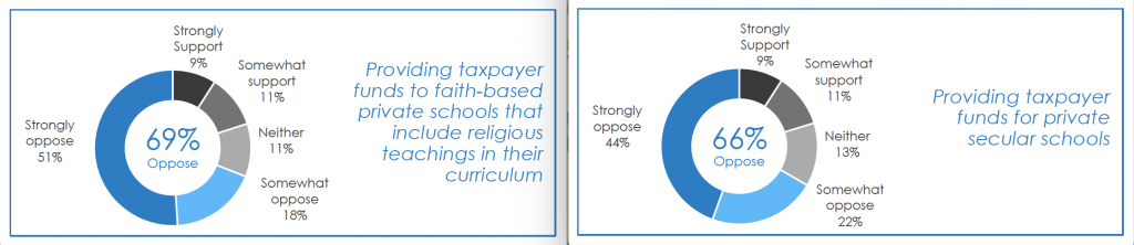 Government funding for religious or faith-based schools is opposed by 69% of British Columbians with 51% feeling strongly against the idea. And two-thirds (66%) oppose public funding for secular private schools with 44% in strong opposition. These sentiments are consistent across generations, genders and regions.